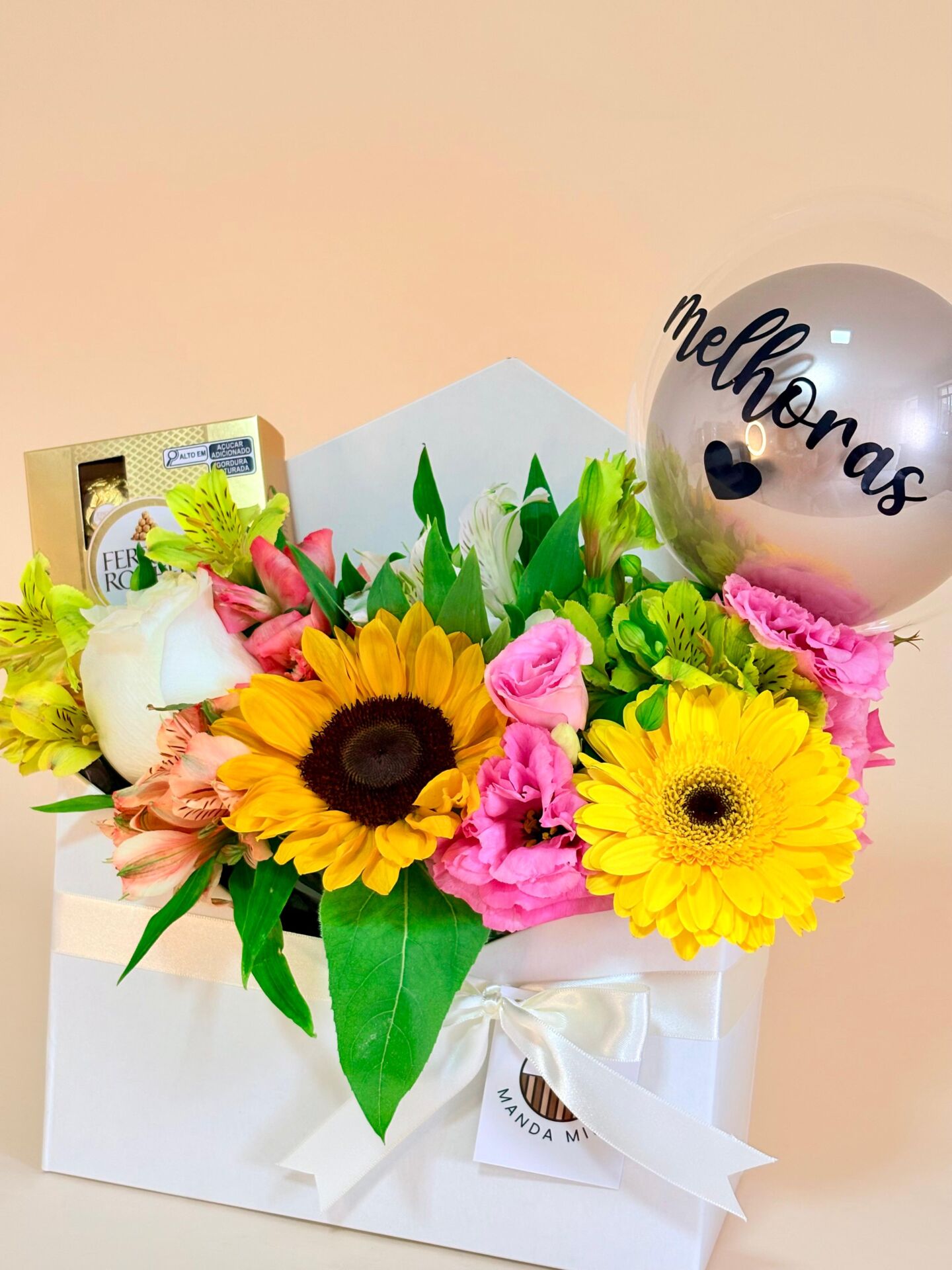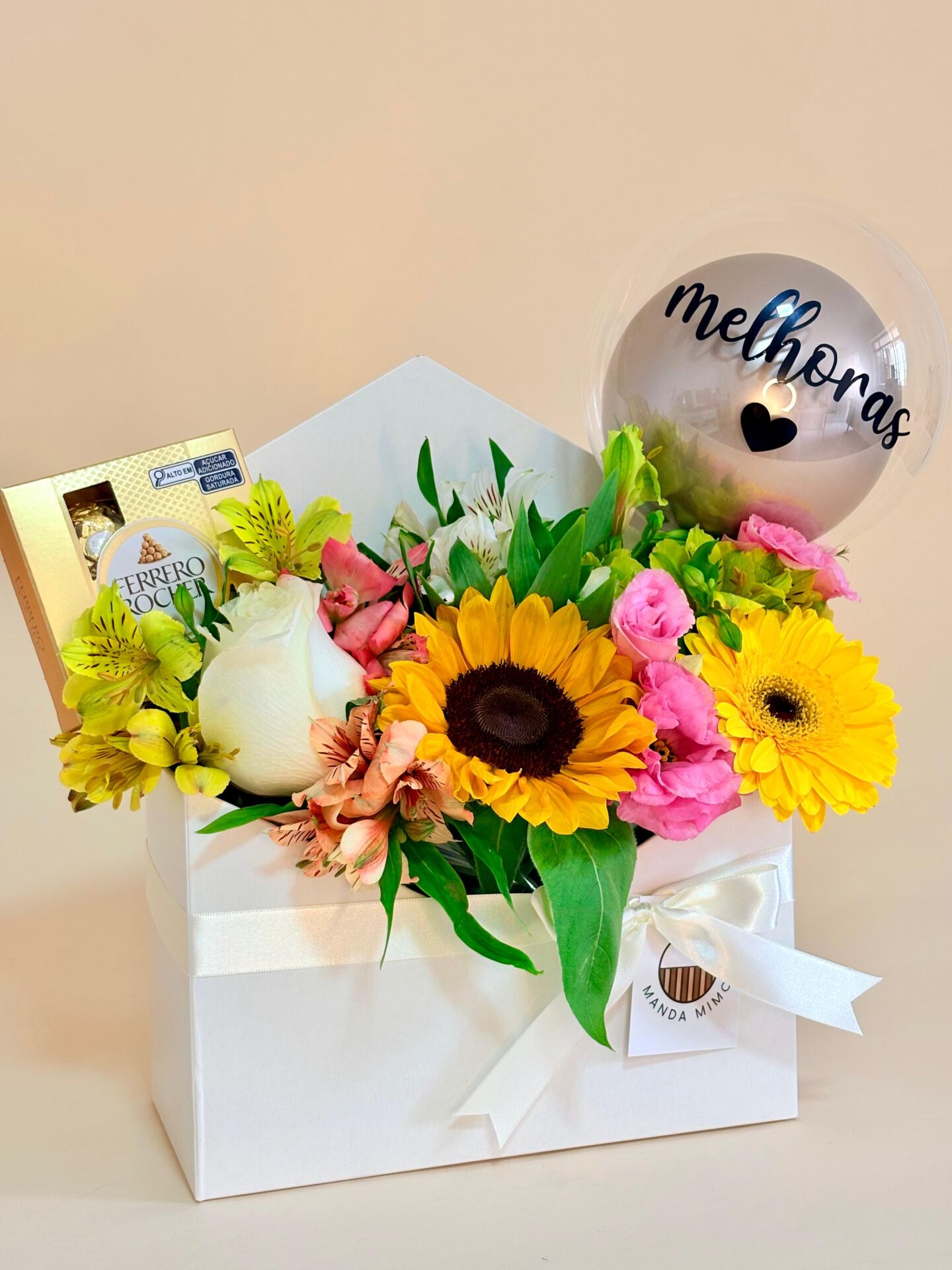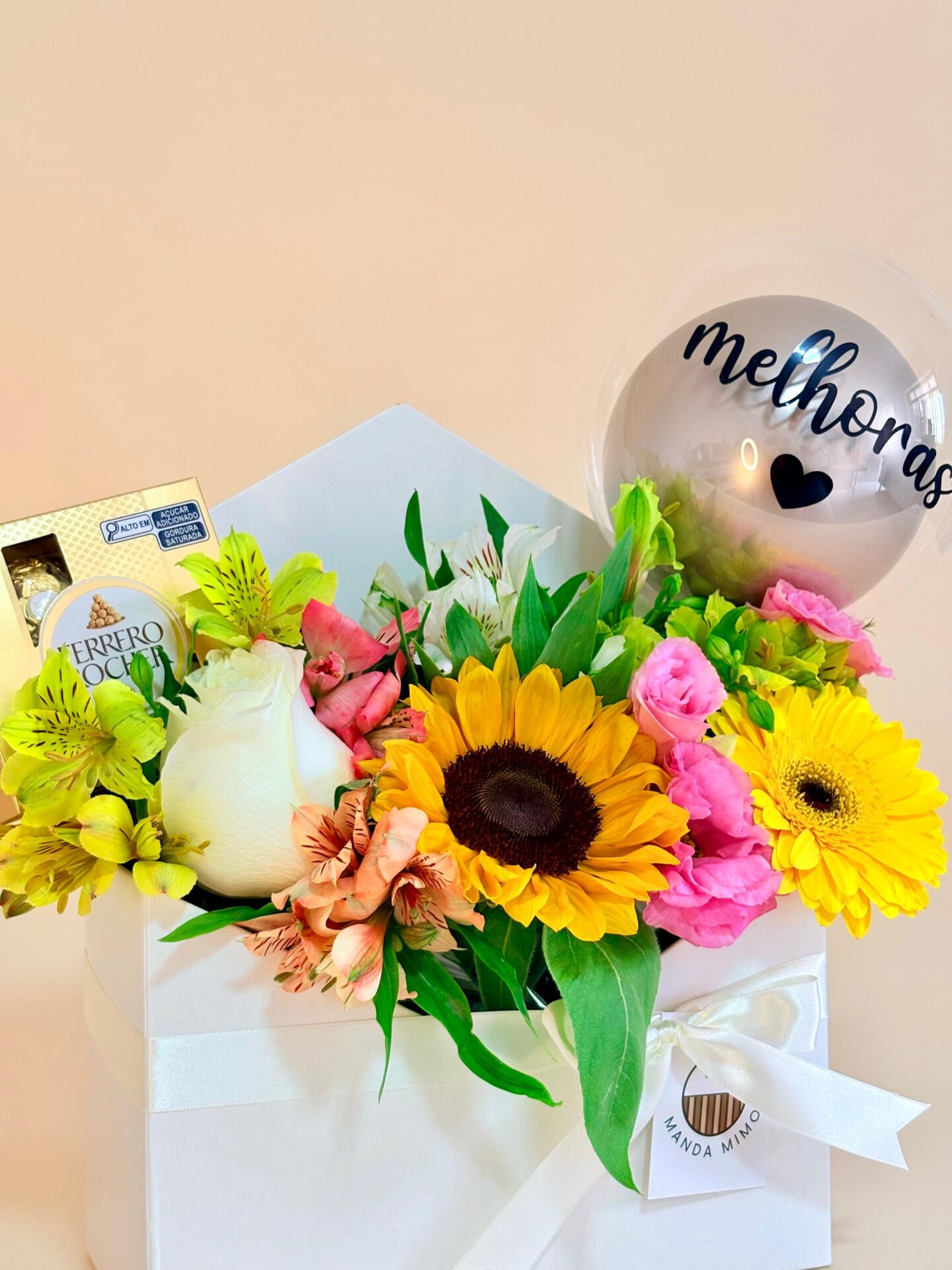 Acompanha: 1 girassol, mescla de 8 hastes de Astromélias coloridas em cores claras, 1 gerbera amarela, 1 rosa branca importada. Além de uma caixinha de chocolate Ferrero Rocher 50g & balão bubble na cor champagne.