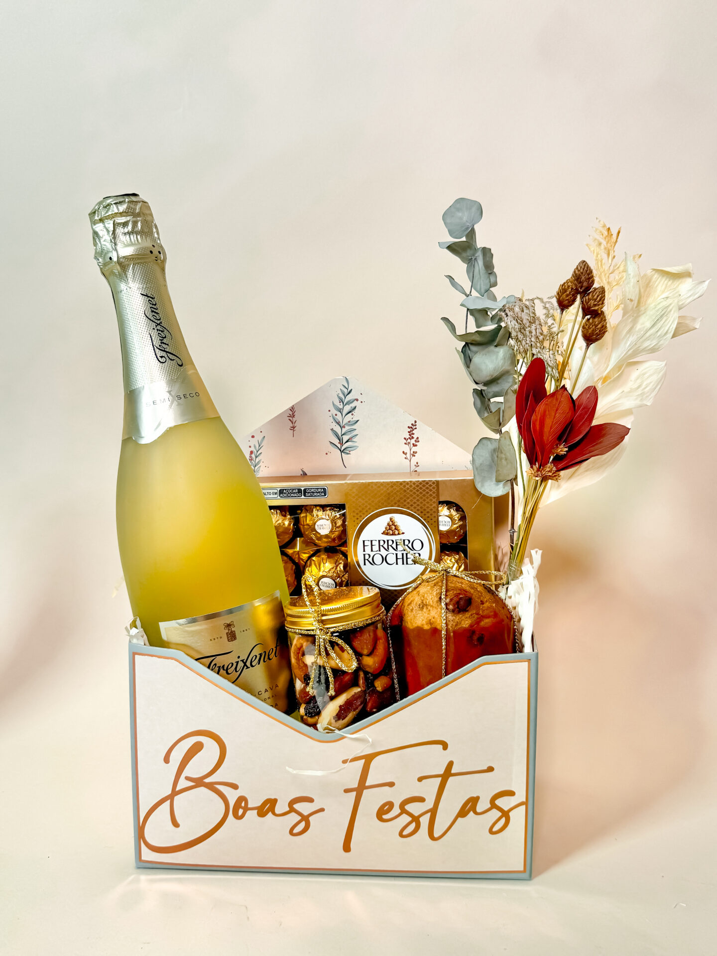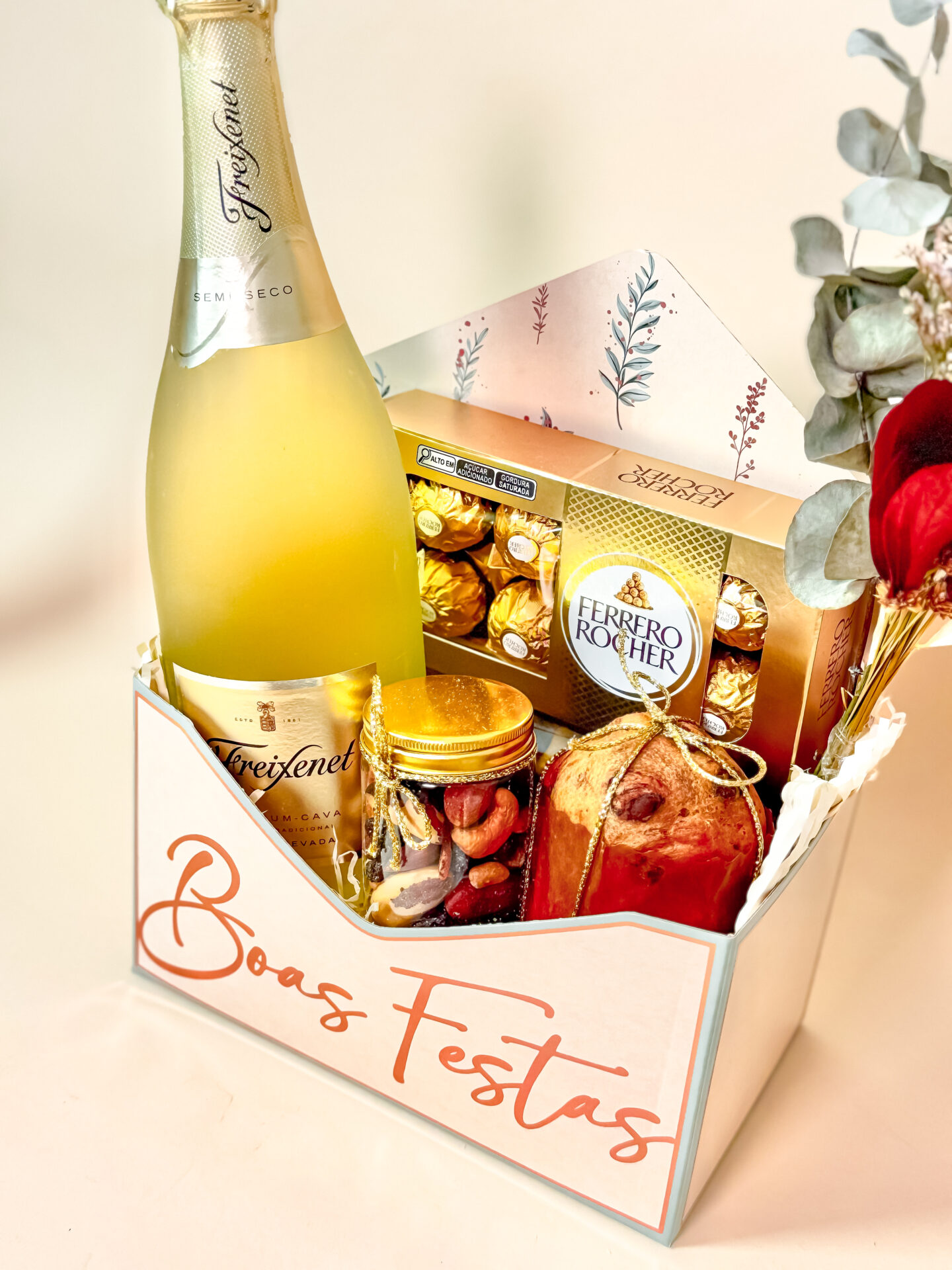 Imagine entregar um presente que convida a celebrar: a Caixa Envelope Boas Festas traz uma Freixenet Semi Seco 750 ml para o brinde, mix de nuts para acompanhar, mini chocotone para adoçar e Ferrero Rocher para finalizar com elegância. Um gesto que transforma o momento em uma celebração completa.
