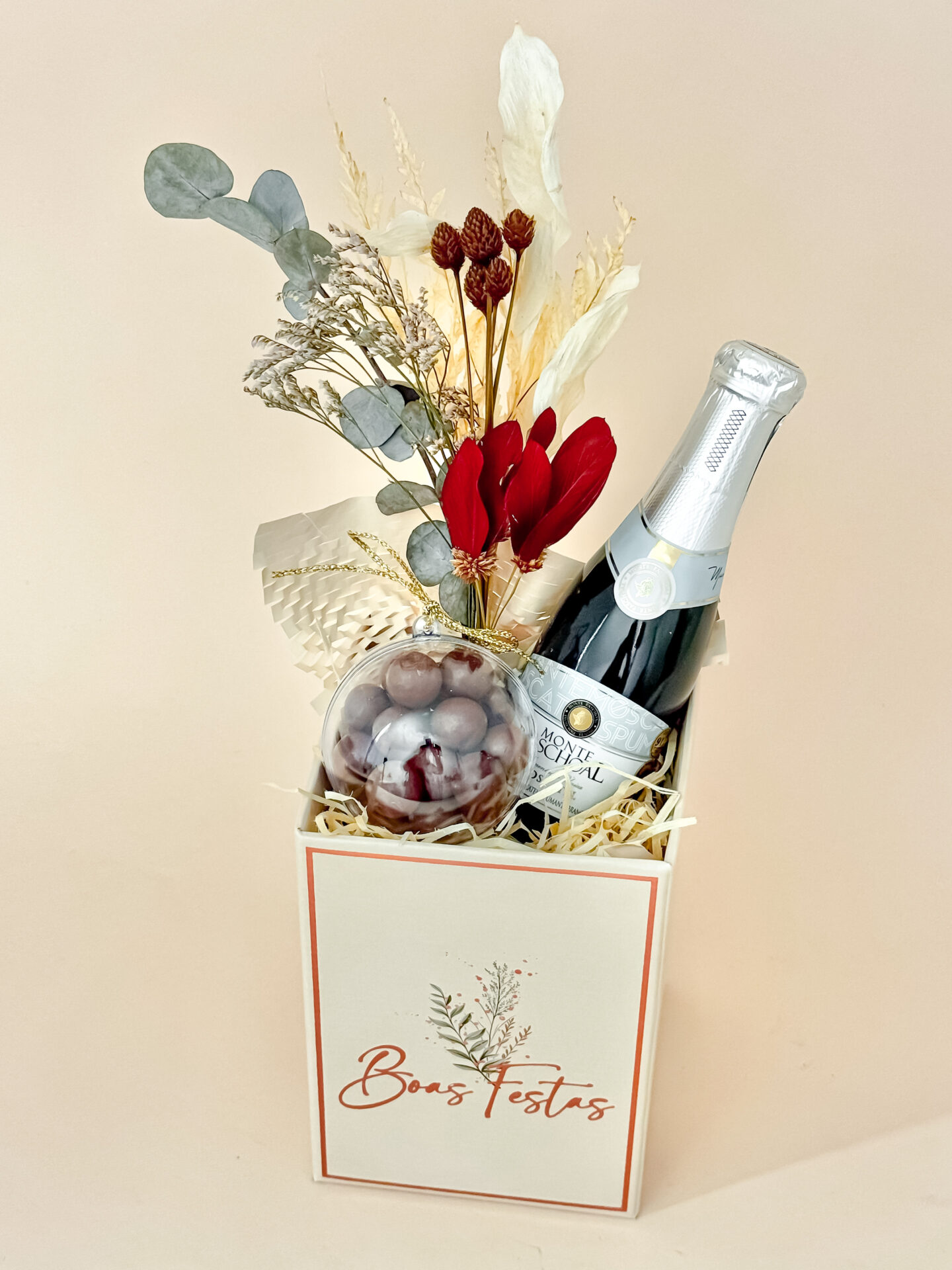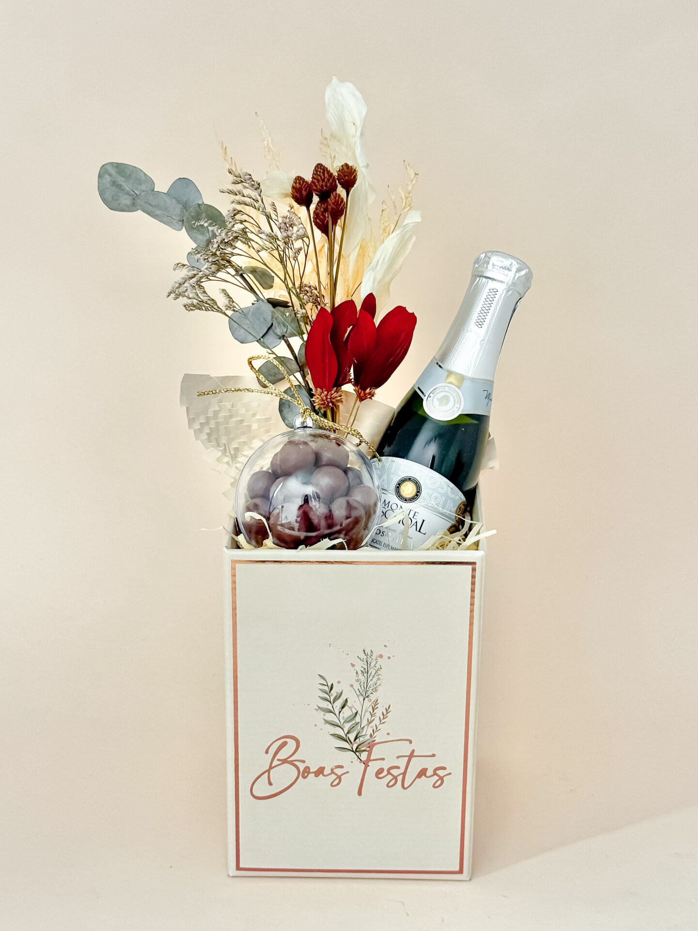 Cachepô Boas Festas com Mini Espumante Monte Paschoal 187 ml + Bolinha Natalina com Drágeas ao Licor 80g.Um presente elegante para surpreender alguém especial ou encantar colaboradores e clientes.