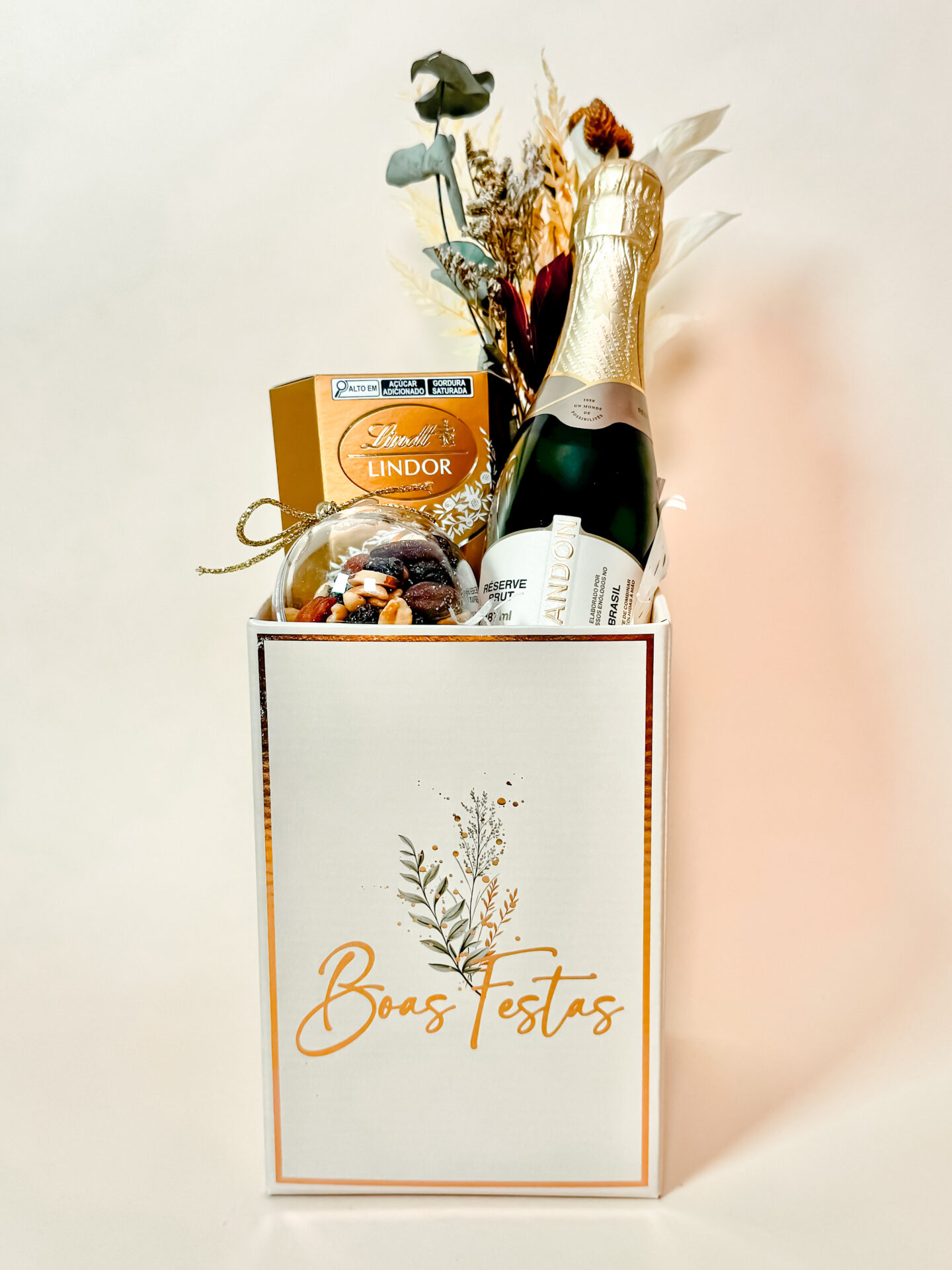 Imagine abrir um presente que traduz o espírito natalino: um Cachepô Boas Festas com Baby Chandon 187 ml para brindar, uma bolinha recheada de mix de nuts para saborear e chocolates Lindt para adoçar o momento.
