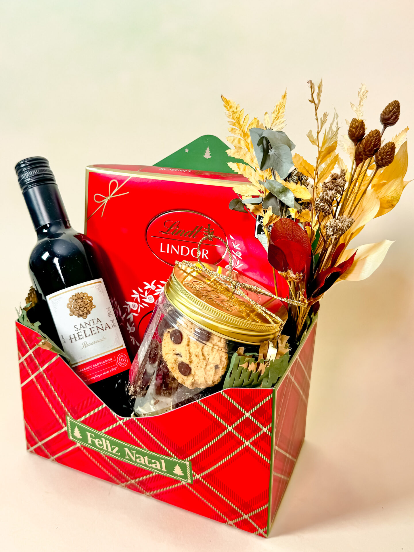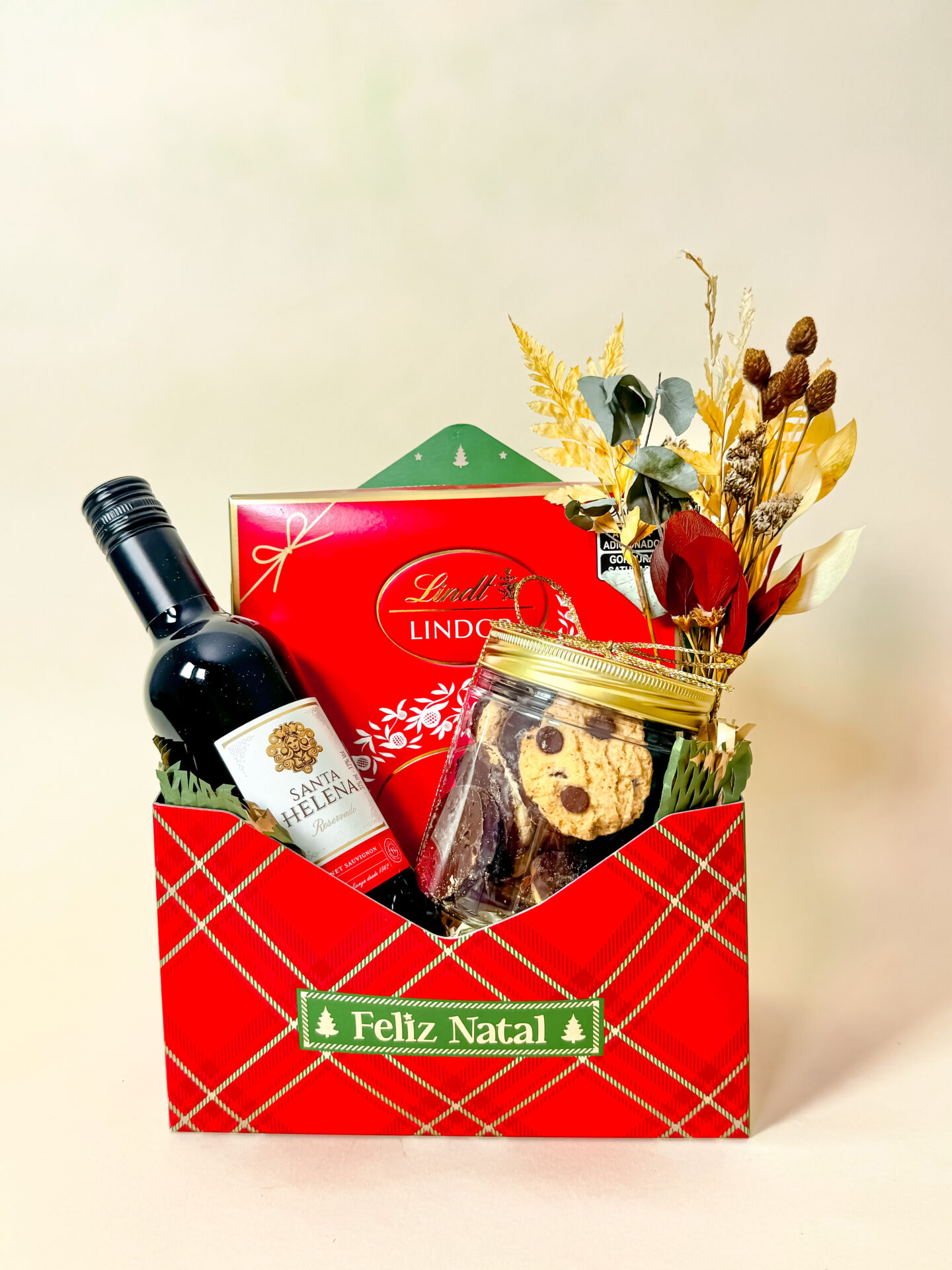 Demonstre amor, gratidão e presença neste Natal com uma caixa que abraça quem recebe. Dentro da caixa envelope Feliz Natal, uma mini garrafa de vinho Santa Helena 375 ml, cookies artesanais deliciosos e bombons Lindt completam a experiência com elegância.